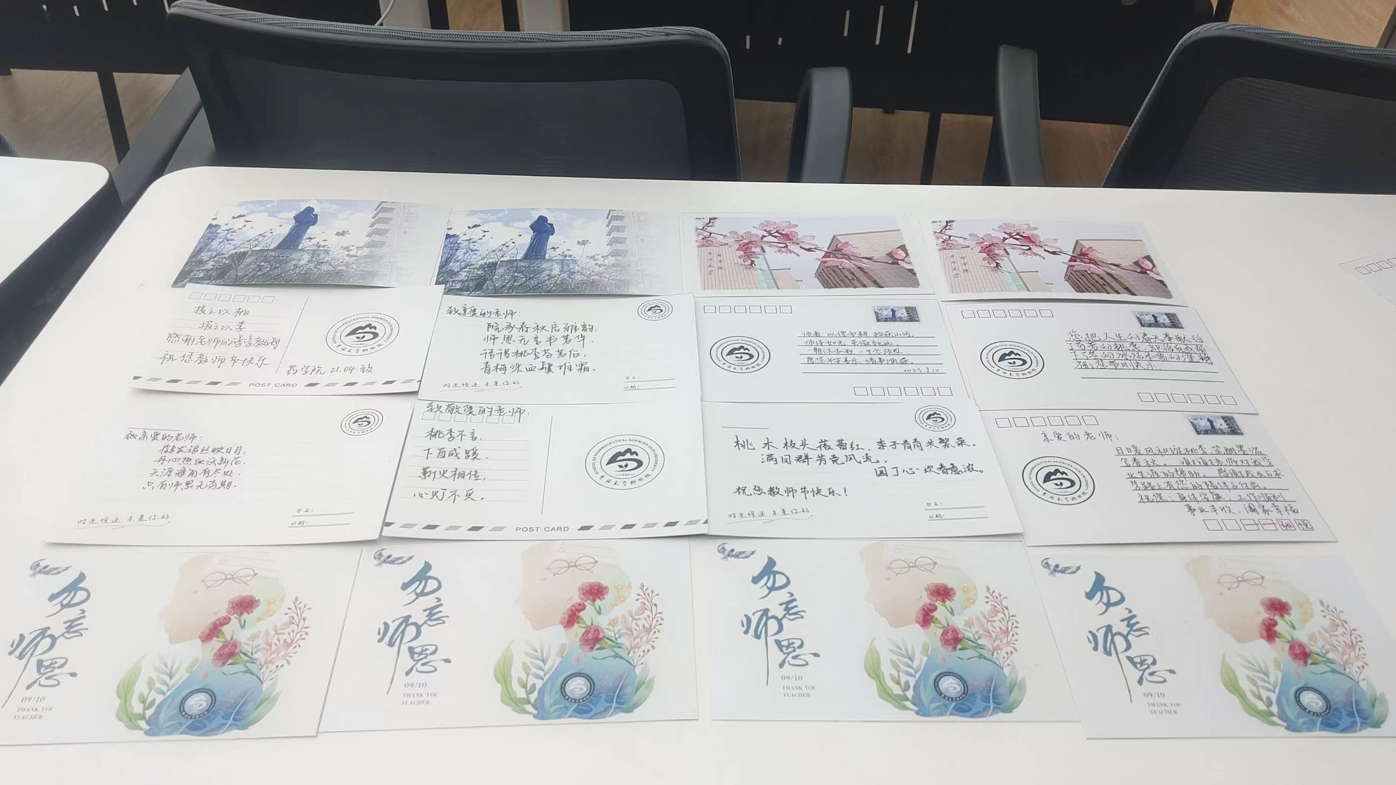 第二天上课,同学们亲手将明信片送给老师和学院的领导,并向老师们表达教师节的祝福。收到同学们赠予的明信片和祝福后,惊喜之余,老师们更多的是感动。那份沉默而深厚的感情,得到了笨拙而又真挚的回应。