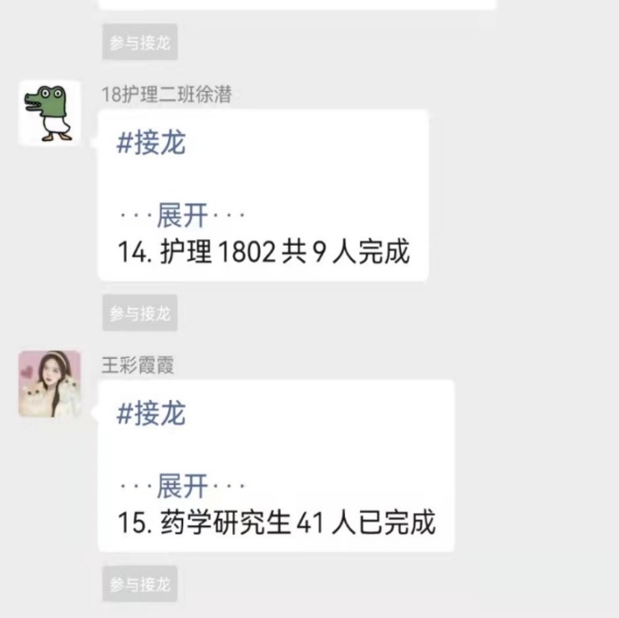 “防疫正在进行时。”3月20日开始,疫情形势变得严峻,深夜七公寓的住楼老师李亚琴老师接到防疫部发来的指令:长春市一日三次核酸检测,不落一人。七公寓的同学们迅速响应号召,表现出很强的组织纪律性。每一楼层每一学院检测完成后都以接龙的形式进行上报汇总,做到每日核酸检测按时完成,无一人遗漏。