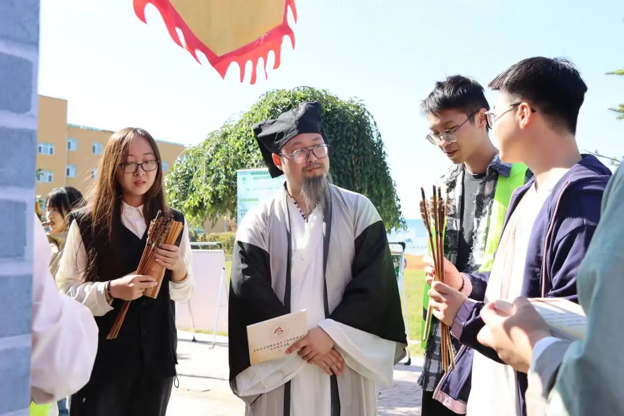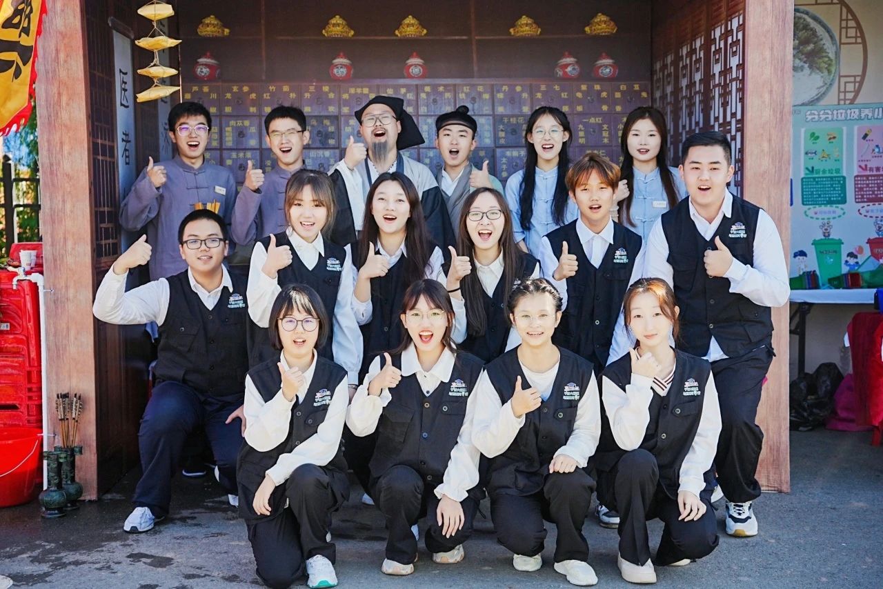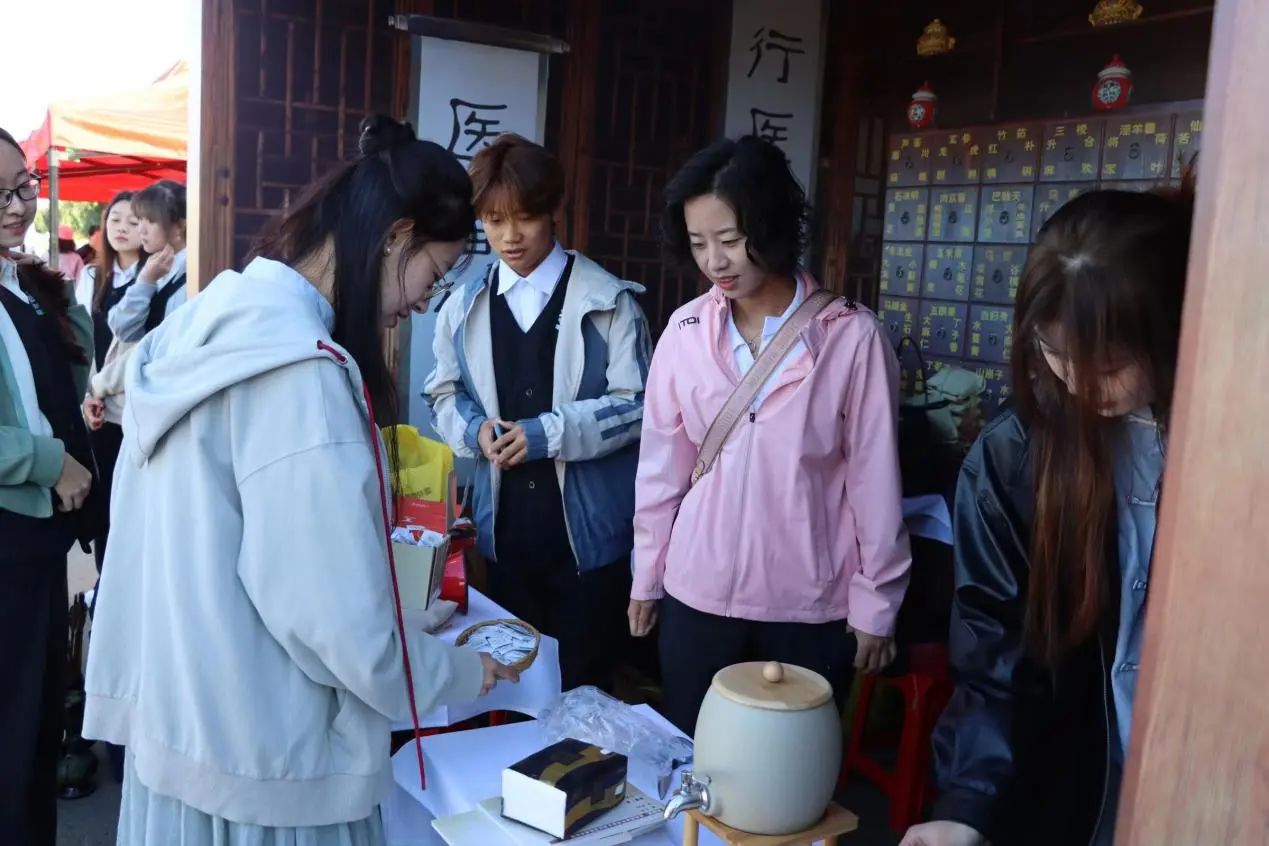 现场共设置两种游戏,在“掂斤估两易本草”游戏中,参与活动的同学在药童决明处抽取作物标牌,前往采摘园中找寻对应作物,采摘完毕后返回药童决明处称重,若在误差范围内,即可兑换酸梅汤食疗药包中的一味药材。参与活动的同学既可亲自体验采摘收获的乐趣,又能认识基地农林作物,并获得相关生药知识的讲解,进一步认识到农业的重要性,药学专业的实用性。在“擘两分星准药量”游戏中,我院在学科基础上融入了中国传统元素,参加活动的同学在药童少辛处抽取写有题号的题签,学徒为同学念出有关中药材知识的题目及选项,同学根据选项将箭投进相对应答案的“壹”壶或“贰”壶中,最后由药房先生给出答案并开展文言文式科普讲解。同学们在游戏中体会古时士大夫投壶游戏之乐,同时也学习了中草药的相关知识。游戏之外,同学们还可在“杏林百草堂”获得纪念印章,为自己的“成绩单”填上一抹靓丽的颜色与标记。