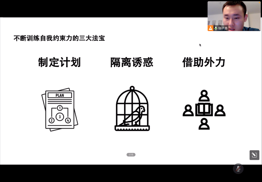 “自我约束,行稳至远。”--自我约束不是持久而强烈的自我压抑而是源自人“趋利避害”的本能,是为了实现更大利益的延迟满足和对现实与自我的清醒认识。为此,张子路同学提出不断训练自我约束力的三大法宝:(1)制定计划(2)隔离诱惑(3)借助外力。在大学阶段,只有养成自我约束的良好品格,才能做到脚踏实地、行稳至远。