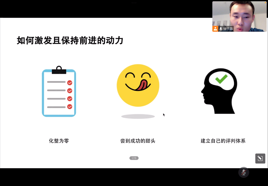 “激发动力,扬鞭奋蹄。”张子路同学提出了三种方法:(1)化整为零,逐个击破,将大目标或大任务拆分为若干个较为简易的小目标与小任务,可以有效降低整个目标或任务的难度,培养自己的信心,从而保持自身的行动力。(2)“尝到成功的甜头”,用前一阶段取得的成绩或成果作为激励自己继续向前的动力。(3)建立自己的评判体系,不用与他人进行比较,我比昨日之我有进步,即为成功。