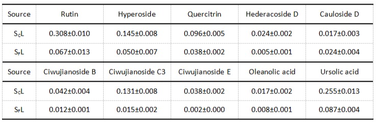 进一步通过基于多变量统计分析的非靶向代谢组学技术,团队还识别出SCL及SFL标志性的20种及7种成分。其中,齐墩果烷型三萜皂苷(如Ciwujianoside C1、C3、D2、E,Saniculoside N等)可作为SCL的鉴别标志,而羽扇豆烷型三萜皂苷(如(1-deoxy-chiisanoside和24-hydroxy-chiisanoside)则适用于SFL的快速鉴定。为精确量化关键成分,研究还建立了HPLC-ELSD方法,实现了芦丁、槲皮素等10种成分的同时测定(表1)。